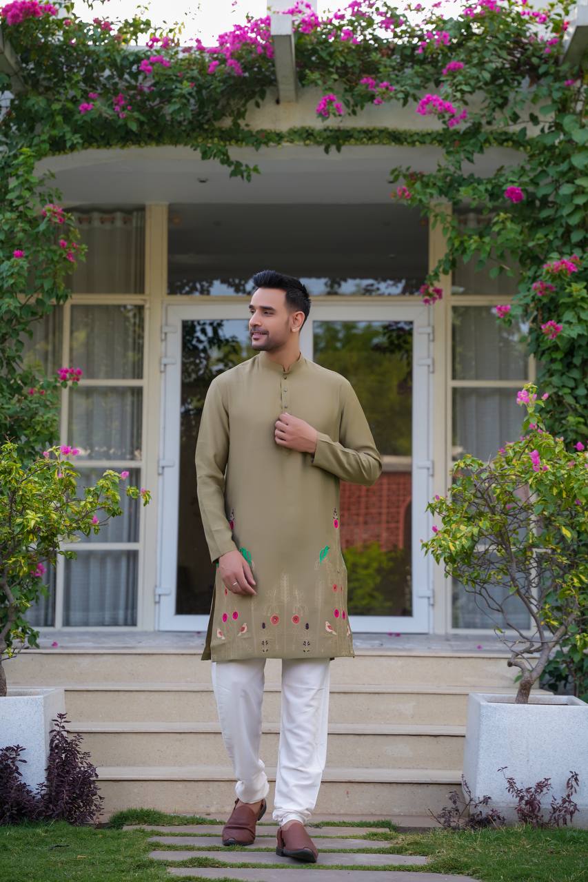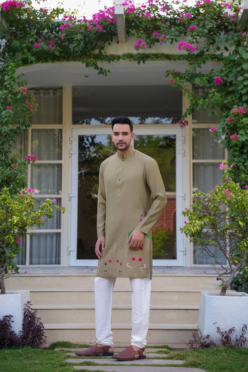 Elegant green kurta-set for men featuring intricate aariwork and jardozi embroidery. crafted from flat silk premium fabric festive look.