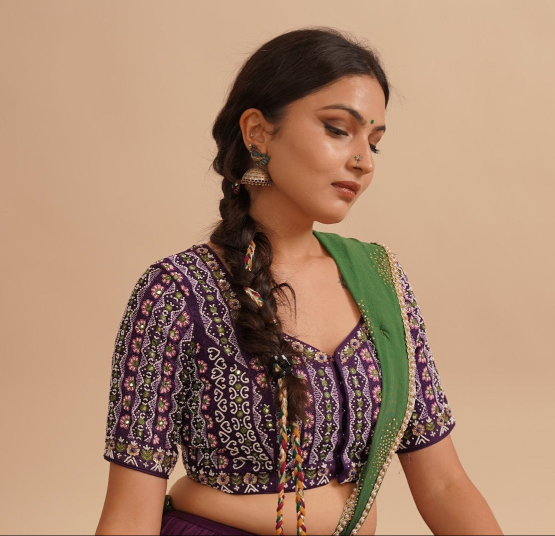 BLOUSE is ardorned with delicate Moti work , intricate bharat embroidery , and sparkling mirror accents , a true blend of tradition and elegance